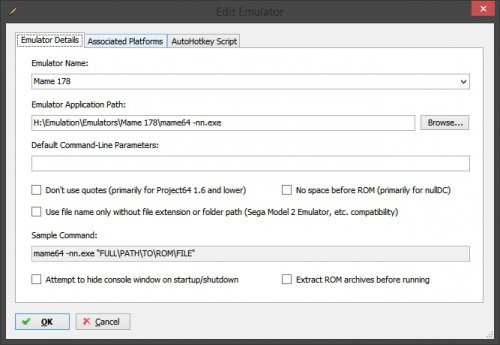 Here's my Mame settings in LB, I don't have any command line parameters since all my settings like skip info is done in the mame.ini Ignore the -nn in the Mame executable, that's just my no nag exe.