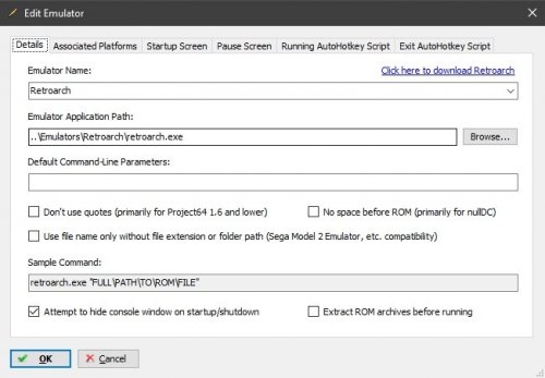 Do you have LB pointed to the Retroarch executable ? The error you are showing is pretty clear in what it is saying. The application you are pointing at is not a valid app for your OS, which means it is either not the correct version ie: 64 bit version on a 32 bit OS or you are pointing at an installer exe or some other file entirely.