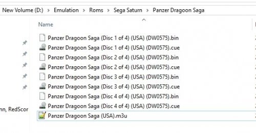 I think it might be the disk images you have, mine are from the Dark Water release and here are the files. Also, here is how my m3u file looks: Panzer Dragoon Saga (Disc 1 of 4) (USA) (DW0575).cue Panzer Dragoon Saga (Disc 2 of 4) (USA) (DW0575).cue Panzer Dragoon Saga (Disc 3 of 4) (USA) (DW0575).cue Panzer Dragoon Saga (Disc 4 of 4) (USA) (DW0575).cue Make sure your m3u file only has .cue files and no .bin files in it. -