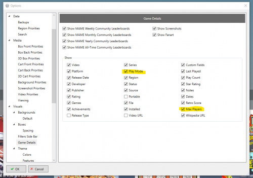 Yes, in the BigBox options there is an option to even view play modes and you can see what the different categories are such as single,multiplayer and etc. Also make sure you have "View Play Modes" checked in the options under game details in BigBox. Also it varies by themes and different views if the coder decided to show max players or not as well in a paticular theme or view.