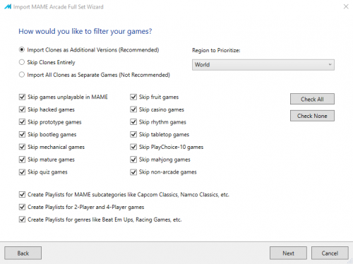 Each month I delete MAME and the auto-generated playlists and re-import (settings below) the new version so that newly added games or no longer working games are correct, this part works fine because of the checkbox "Skip games unplayable in MAME". However, at the same time I want to import a select few non-arcade games (121), for example Handheld / Electronic Games that fall under the category "non-arcade games" and exclude the rest of the non-arcade games as well as utilise the "Skip games unplayable in MAME". The solution I run with at the moment is to create a platform for the Handheld / Electronic Games which points to the MAME folder and then each month manually check the channel log and confirm added/no longer working games and either import manually or mark as Broken and Hide. An option could be to create my own Smart Playlist for Handheld / Electronic Games and filter out the games I don't want however I still need to import ALL the non-arcade games, which I'm trying to avoid. Maybe something like this but has checkboxes to select all or a few games and at the end an option to "Skip games unplayable in MAME" as well as all the other options. Its also similar for the Arcade Vector Games playlist which I have to repeat the same thing however they are not under "non-arcade games" so some steps can be left out, tried smart playlist however they can't search for the word "Vector". Any ideas or am I stuck with the solution I have currently?