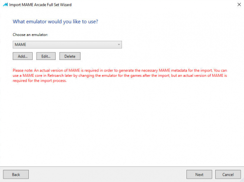 If you don't select the emulator MAME in the import process you get the following message, maybe a friendlier explanation, but thought you could import with another emulator than actual MAME but it won't generate the metadata was on 11.17. Also, importing MAME games not checking the box so it gets the MAME metadata it only imports a random number from the total on version 11.18-beta-3.