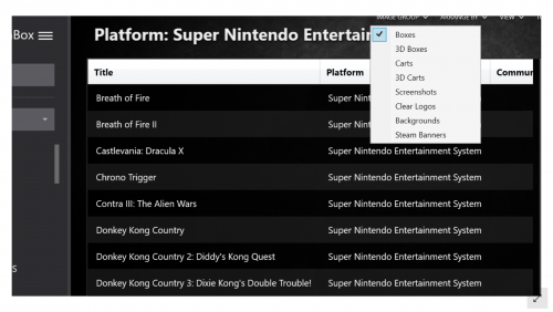 That's actually pretty nifty looking! To speak what I think is your general question, you could tell launchbox to only display box art for every system, or only clear logos or whatever you want. What's weird is that last screenshot looks identical to launchbox's options, only its called Image Group... In this way, if you just wanted to download box art, or 3D box art, you could set all your systems to just display that. However, there are hundreds of systems, and not all have boxart (some don't have any art). Things get a little more tricky if you ever want to use Bigbox though, as Art types are embedded in the themes there. Edit: Since I personally don't use launchbox (prefer bigbox) for anything but set up, I keep mine in "List View" and that's why you don't see any artwork displayed for the games.