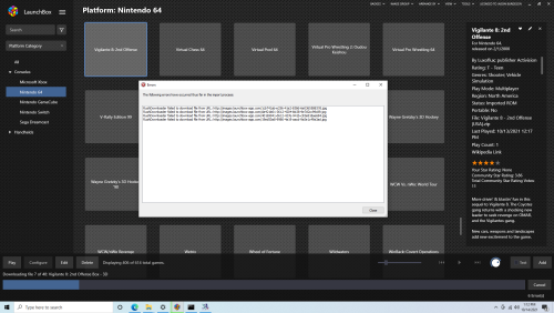 HI All! I just started another new setup of LaunchBox using a brandnew install of 12.1 After adding games and trying to download images from the LaunchBox repository, it fails everytime. Attached is the screenshot of the error. EmuMovies is downloading without issues...just slow. Thanks!