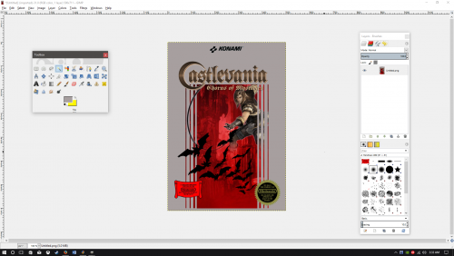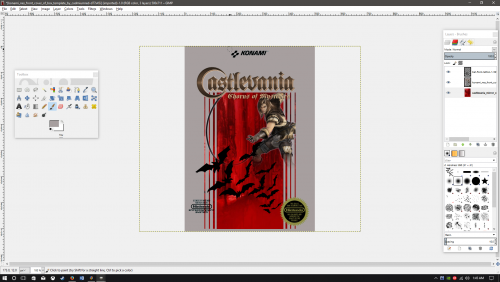 Hello All, I'm attempting to mock up some new box-art for Castlevania Chorus of Mysteries (ROM hack) since I want something that looks more like the classic Konami art from the NES. I'm having trouble with figuring out how to get the right side of the characters body to appear behind the "piping" on that side of the box. I want to keep the whip and the rest of the character in the foreground as it is, but can't figure out how to get that part of the body into the background. I figure it's with the Foreground Select Tool, but I guess I'm not doing it properly or something. If anyone out there who is more proficient with GIMP than I am knows how to make this work, I'd appreciate it. I literally just learn as I go with this program, but this is giving me a hard time figuring out and what I've searched isn't turning up the effect that I'm looking for.