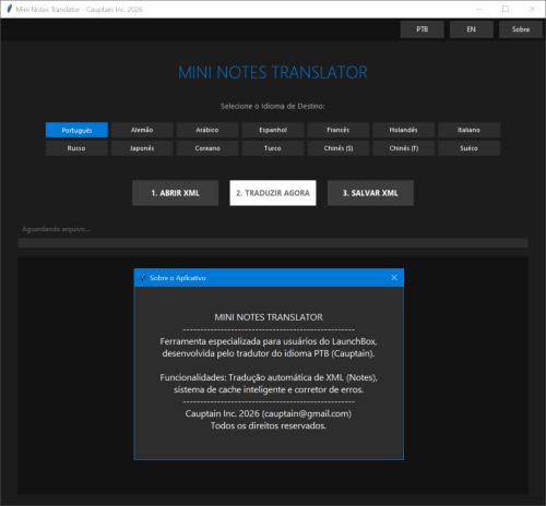 Mini Notes Translator é um utilitário focado na tradução da Descrição/Detalhes dos jogos no Launchbox. Ele funciona utilizando a mesma estrutura XML. Inicialmente eu desenvolvi pensando apenas na tradução do meu idioma, português do Brasil, mas ao olhar para os anos em que todos os outros tradutores se dedicaram tanto para tonar o Launchbox tão especial quanto ele é hoje, senti que não podia deixá-los de fora e com isso tornei o Mini Notes Translator universal. Todos os idiomas presentes no Launchbox poderão ser utilizados para traduzir os Detalhes dos jogos. Todos!! Deixo aqui meu agradecimento a cada um deles: @Opak @Kondorito @Nyny77 @dukeemu @cyanjiang @Just001Kim @MajKSA @gamehacker @alexposad @k_kutsugi @Bardock @Soomin papa @thewhite Basta abrir o aplicativo, selecionar a plataforma.xml que quer traduzir, escolher o idioma, clicar em traduzir e esperar. Assim que finalizar, salvar e ir jogar. ---------------------------------------------------------------------------------------------------------------------------------------------------------------------------------------------------------------------------------------------------------------------------------------------------------------------------- Mini Notes Translator is a utility focused on translating the Description/Details of games in Launchbox. It works using the same XML structure. Initially I developed it thinking only about translating my language, Brazilian Portuguese, but when I looked at the years in which all the other translators dedicated themselves so much to making Launchbox as special as it is today, I felt that I couldn't leave them out and with that I made the Mini Notes Translator universal. All languages present in Launchbox can be used to translate game details. All!! I would like to thank each of them here: @Opak @Kondorito @Nyny77 @dukeemu @cyanjiang @Just001Kim @MajKSA @gamehacker @alexposad @k_kutsugi @Bardock @Soomin papa @thewhite Just open the application, select the plataform.xml you want to translate, choose the language, click translate and wait. Once finished, save and go play. LINK: MNT Setup.exe
