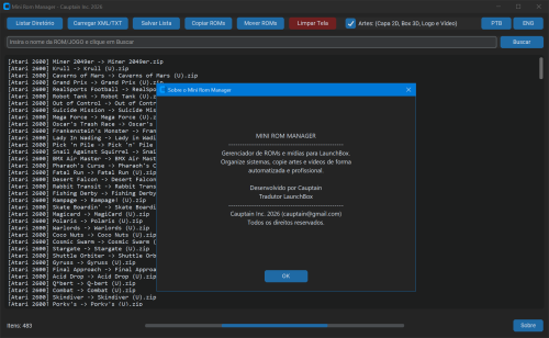 Mini Rom Manager é uma ferramenta desenvolvida para organizar e gerenciar bibliotecas de ROMs de forma automatizada. Seu objetivo é estruturar arquivos brutos, garantindo padronização de nomes e organização adequada de diretórios para uso em ambientes de emulação. A aplicação realiza varredura de diretórios definidos pelo usuário, identifica arquivos compatíveis e aplica regras de organização conforme sistema ou categoria. Também executa operações como listagem, cópia, movimentação e salvamento de arquivos. O sistema prepara as ROMs para integração com frontends como LaunchBox e RetroBat (parcial), assegurando que os arquivos estejam corretamente nomeados e posicionados para reconhecimento automático. Com foco em eficiência e redução de processos manuais, o Mini Rom Manager simplifica a manutenção de grandes coleções, proporcionando consistência estrutural e melhor gerenciamento da biblioteca. Aproveitem!! ------------------------------------------------------------------------------------------------------------------------------------------------------------------------------------------------------------------------------------------------------------------------------------------------------------------------------------------------------------------------------------------------- Mini Rom Manager is a tool designed to organize and manage ROM libraries in an automated way. Its purpose is to structure raw files, ensuring standardized naming conventions and proper directory organization for use in emulation environments. The application scans user-defined directories, identifies compatible files, and applies organizational rules based on system or category. It also performs operations such as file listing, copying, moving, and saving. The system prepares ROMs for integration with frontends such as LaunchBox and RetroBat (partial), ensuring that files are correctly named and positioned for automatic recognition. With a focus on efficiency and reducing manual processes, Mini Rom Manager simplifies the maintenance of large collections, providing structural consistency and improved library management. Enjoy!! LINK: MRM Setup.exe