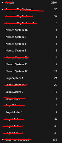 i have nearby 25.000 games with around 17 TB of used storage for that. Ah, yes. over 70 System so far. I like to divide arcade systems instead of having them all under ARCADE like CPS 1 to 3, Model 1 to 3. or all the different Namco Systems 8.500 C64 and 2.500 Amiga games are also waiting to import but to match them with the GamesDB is horrible and I will wait until there is a easy to use solution for that. I am also trying to match around 1.700 games with the DB. mostly MSX1 and 2 Games.