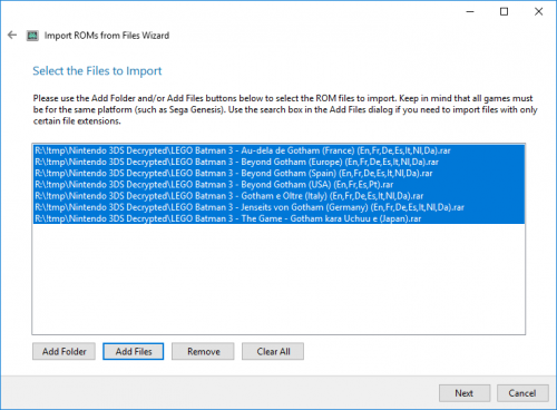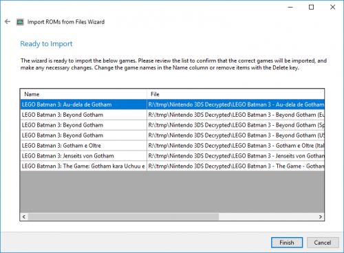 Just imported 7 games with 8.3-beta-3 for the purpose of testing the "Combine ROMs with matching titles into single game" feature introduced with version 7.7. My understanding is that imported roms sharing the same title should appear only once. In the following test, I imported 7 roms (different variants of the same game) but the import process resulted with 4 games sharing the same title. Additionally, when I select "Edit game" to compare the game path and additional apps across these 4 game titles, some of the roms are referenced more than one. For instance, "LEGO Batman 3 - Au-dela de Gotham (France) (En,Fr,De,Es,It,Nl,Da).rar" is referenced 4 times. See the spoiler below for details. The roms names were created using No-Intro [Nintendo - Nintendo 3DS (20180414-025333).dat] to insure a supported naming convention was utilized.