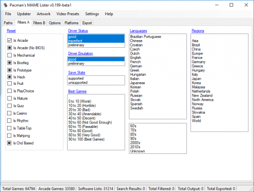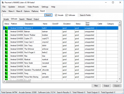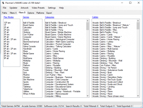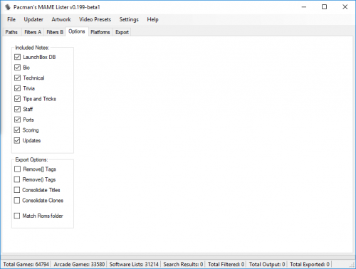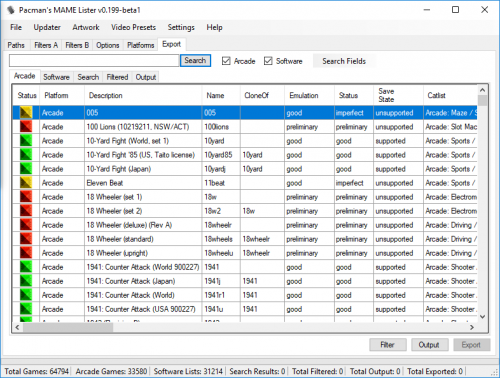 I'm also a great fan of Lightspeed an would really like to see its development continue. In the mean time, I've spent the last few months creating my own version which is very much inspired on @Antropus great work. If there is enough interest from the community, I might upload my personal implementation of "Pacman's Mame Lister" to this site but the problem I have right now is that I'm using Antropus status images on the Export tab simply because my graphic artist skills are pretty bad. I first need to have those images redesigned to avoid copyright infringements. I would also like for Antropus to be okay with me releasing something that is in essence very similar to his work. Last I want to do is offend anyone. Keep in mind that my implementation is nowhere near as nice as Lighspeed but it's gets the job done for what I need. Here are some screenshots:
