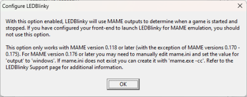 Yeah in my case, when I pause MAME, the LEDBlinky pause animation starts but maybe a different emulator would need the EIP Pause integration. So I tried all the suggestions but LEDBlinky still won't light the controls properly unless that check box (Use MAME to Trigger the Start Stop Events) is checked. Something to note, when I check that box, a warning pops up. I don't know if this helps or not. I'm noticing that the taskbar gets set to hidden on first launch of EIP. Is is supposed to set it back to visible on exit? I attached a couple log files. One shows the original taskbar state is visible. I exited and restarted EIP and you can see on the second log it shows it is initially set to hidden. Also attaching my ini file in case you wanted to double check my settings. I was screwing around with the delay stuff if you see an extra delay(1000) in there. And yes I set a $h!t load of autoswitching games in there, LOL. 01-arcadeEIP.log 02-arcadeEIP.log arcadeEIP.ini -