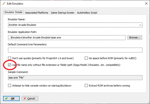 25. I know this is an old post but someone else might need the info. The AAE page says "run AAE.EXE to start the built-in GUI, or aae gamename to run a specific game. " In order to do that, go into manage emulators, select Another Arcade Emulator and click edit. Click the use file name only without extension or folder path..... That's it. Once a game loads you can press tab to get to the menu.