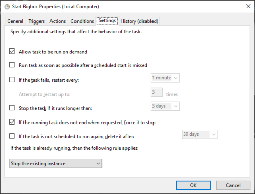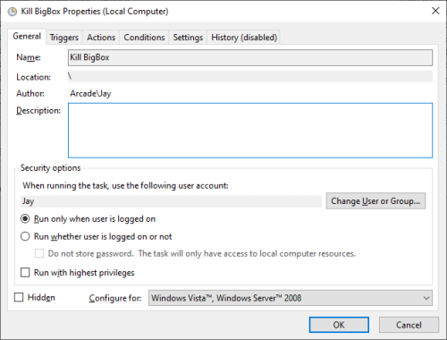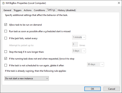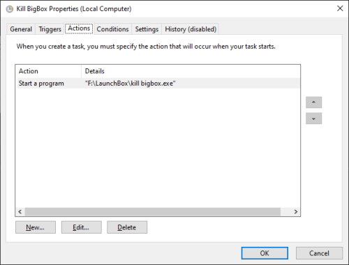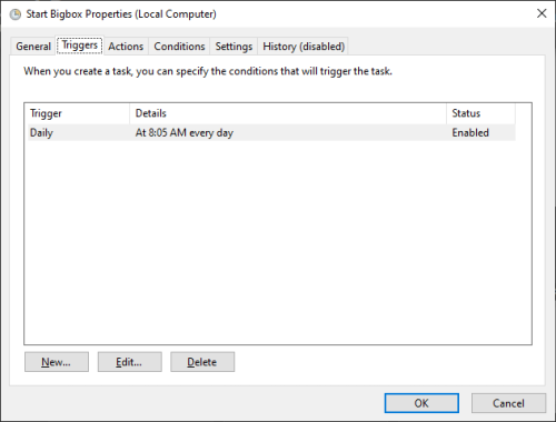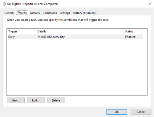 Oh, yeah. I guess I should have mentioned that. It's an autohotkey script/exe. If you want to compile it yourself, here is the code. Run it at your own risk. Someone here might say its not the correct way to close Bigbox, but I've had it on this system since well before the pandemic started and I've had zero issues. 🤷♂️ SetTitleMatchMode, 2 KillProcessTimer: Process, Close, BigBox.exe SetTimer, KillProcessTimer, -10000 return Exitapp I guess I lied. I have it set for 8 am not 9 am. Kill. Not sure why I set it for Windows vista but it works. I might have just been experimenting. Start. This one is set for windows 10.