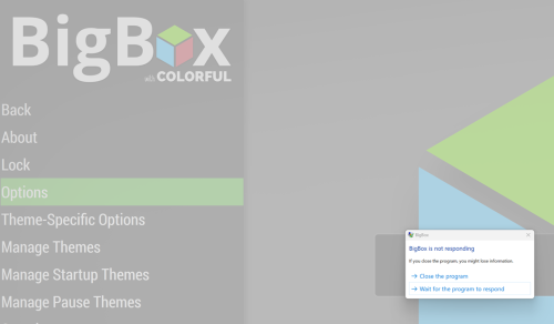 Hey and thanks for a fantastic product. I've not used Launchbox for some time, but I just added a new set of games and I wanted to go through them and add favourites. I therefore started up Big Box and my plan was to go to Options to check if there is a key binding for favourites there so I didn't have to enter the sub meny to do it for every game. However, when I enter Optins, Big Box just hangs and nothing happens. I've tried a few times now, waited for a about 5 mins or so before I quit the program. I'm not really sure where to start troubleshooting. Have anyone got a hot tip for me?