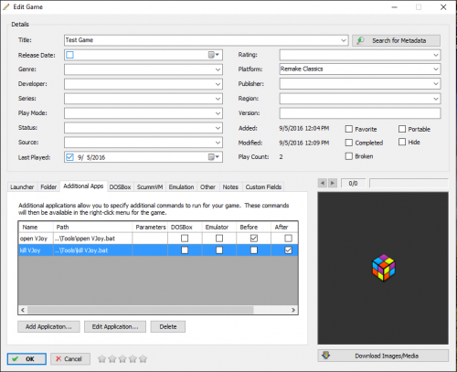 Sounds good, I think I got this bat file working and you'll need 2 .bat files. One to open the app and another to kill the app. In Additional Apps, Add Application for opening VJoy there and select "Automatically Run Before Main Application" and "Wait for Exit" @echo off start "VJoy" "C:\Program Files (x86)\VJoy\VJoy.exe" exit In Additional Apps, Add Application for closing VJoy and select "Automatically Run After Main Application" @echo off taskkill /f /im VJoy.exe exit I found that when starting an app with a batch file the reason it wasn't starting was because of spaces in the path to the .exe. That's why you put start "name of app" <-- can be anything, then path to the .exe in quotes. These 2 .bat files should do the trick and under the Launcher tab in your launchbox game is where Application Path, in your case Mortal Kombat. Edit* You can also use this method to use AHK scripts, just compile the ahk file as exe and do it the same way as above. And here's a screenshot of what I have.