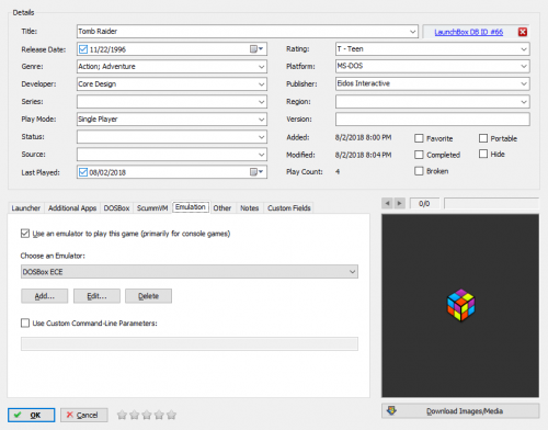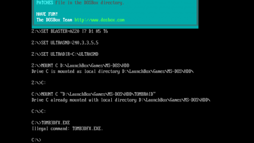 I've hit the weirdest problem with LaunchBox (both LaunchBox and LaunchBox.Next). It's mounting a default directory even when it doesn't exist in the setup. I've tried looking in the data files and didn't see anything, but I'm no expert on LB. This happens with any DOS game I've tried using with a different emulator. When I use basic DOSBox it's fine. When I try to use another version from the "Emulators" list it seems to be using a .conf from somewhere else. But I can't find it anywhere. Here's the setup: Then I get this: The "D:\Launchbox\Games\MS-DOS\HDD\TOMBRAID" isn't in my setup anywhere as you can see. I've even deleted the previous setup completely and added Tombraider again from scratch and nothing changes. Thanks guys, Ranth