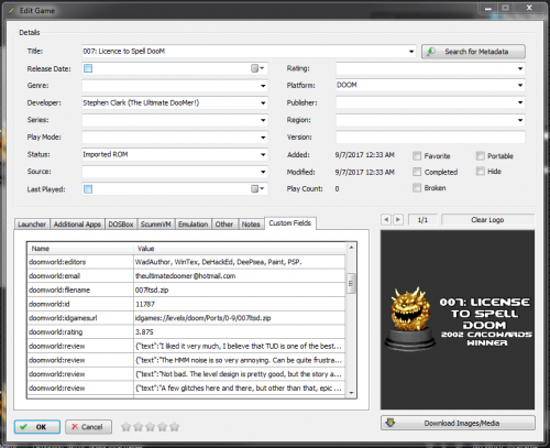 @Klopjero I've loaded enough data (very minimal, just the "roms" and clear logos) into my LaunchBox to use as a working base and I have tested the API with success. All that remains is the actual implementation. If I can trust the zip/7zip to have a good filename I can implement the needed logic quite reasonably. For example, here is a call using one of the filenames. I could also do a far slower search if needed where I look inside the 7z/zip files. https://www.doomworld.com/idgames/api/api.php?action=search&query=007LTSD&type=filename&sort=date https://www.doomworld.com/idgames/api/api.php?action=search&query=007LTSD&type=filename&sort=date&out=json While I might have larger plans in the future (I am overzealous when it comes to such plans) I figure I can have a basic scraper working and released relatively quickly when I find the time to sit down and work on it. I can probably get it working in just a few hours of work.