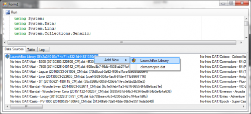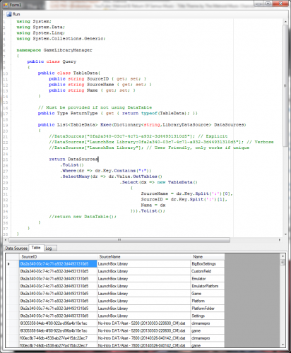 Well, I did use this really basic script with it to set all my items with no Series set to be in the "~Not Set" series: using System; using System.Data; using System.Linq; using System.Collections.Generic; namespace GameLibraryManager { public class Query { public DataTable Exec(Dictionary<string,LibraryDataSource> DataSources) { LaunchBoxDataSource lb = (LaunchBoxDataSource)DataSources["LaunchBox Library:0fa2a340-03c7-4c71-a932-3d44931310d5"] lb.Get("Game") .Where(dr => dr.GetField<string>("Series") == null || dr.GetField<string>("Series").length > 0) .ToList() .ForEach(dr => dr.SetField("Series","~Not Set"); lb.Save(); return null; } } Theoretically you could do stuff like combine it with other data sets and apply changes or inserts. I'm still trying to simply the interface of the code but I'm wondering if the whole thing is just too complex for anyone to use anyway.