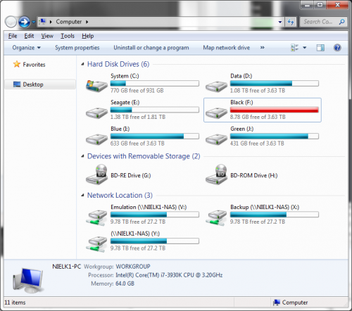 Wow... I think I am going to become @DOS76 at some point. "Black" is where I keep a copy of every DRM free game and album I ever buy in bundles. "Blue" has the music and a lot of random crap. "Seagate" is an old Seagate that's slowly dying. Data, Black, Blue, and Green are all WD 4TB Black drives. The NAS is 6 WD 6TB Red drives I have 3 4TB WD MyBook and 1 3TB WD MyBook externals which I used to do backups on but are currently not being used due to the purchase of the NAS. I currently store my roms on my NAS and that seems OK so far, but I am still setting everything up. My LaunchBox is really slow due to the library size but that's in part because I am still cleaning things. I have over 2K paid games on Steam. I believe in paying developers for their work when possible. I also believe in archiving and do my best to store things.