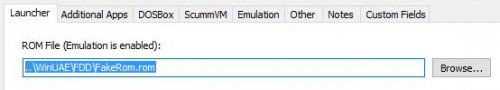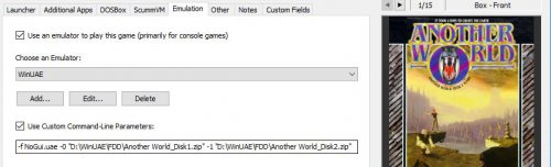 2. I've tried a way to load WinUAE directly from Launchbox. But I only had .adf files in .zip format, and they do not load in the ROM-field. But after trial and error I discovered the solution is quite easy and something like WinUAE Loader is not needed. First I added WinUAE.exe as an Amiga emulator in Launchbox. Then I created an empty file called FakeRom.rom. In the directory of the WinUAE program I created a directory FDD in which I placed the several .adf files I had. Then I added these games in Launcbox. In the Launcher tab in the "ROM File (Emulation is enabled)" field I entered the following: ..\WinUAE\FDD\FakeRom.rom . Then in the Emulation tab I checked the "Use an emulator to play this game .." box. Added WinUAE in the "Choose an Emulator" field. Checked the "Use Custom Command-Line Parameters:" box and entered the following for (in this case) the game "Another World": -f NoGui.uae -0 "D:\WinUAE\FDD\Another World_Disk1.zip" -1 "D:\WinUAE\FDD\Another World_Disk2.zip" NoGui.uae stands for a start of WinUAE without the GUI opening. The next entries are for both .adf files loading into drives DF0 and DF1. In this configuration the game starts perfectly. (WinUAE will extract the .zip files with the .adf files automatically). You can do the same with games consisting of more than 4 floppy-disk images. But the you have to make a different configuration file (specifically for this game) in which the "diskswapper" is loaded which in it's turn loads the disk-images. Then it will start-up and run too