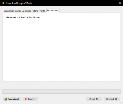 3. As I mentioned, during import it works fine. It's after importing that it doesn't for me. The Platform is Sony Playstation 2 (unless you are referring to something else). I deleted the rom, and manually dragged and dropped it back in, and the import dialogs came up (i.e. choose platform, scrape media, etc.), and that worked just fine... it got the information from Emumovies & the Launchbox database. I'm just saying if you right click any game (whether if it's already scraped or not), choose Edit, go to the "Media" section on the left column; Click "Download Media"; the box pops up to choose what to download in the "LaunchBox Game Database" tab, then I click the "Emumovies" tab, then it says game not found.