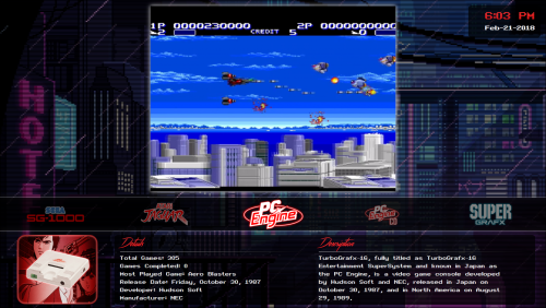I'm glad to see you getting back in to the swing of things. The alt dreamcast image looks great by the way I love this theme but I also liked your blade runner theme as well so I tried to incorporate aspects of it into this theme. I don't know a lot about coding themes so I had to do a lot of guess work. I deleted the date at the top and the description at the bottom. I added scan lines to the video and I centered the platform banner at the bottom. I also added the icons from the blade runner theme at the bottom as well. I'm happy with how it turned out. By the way, I read on the forums that bigbox supports animated gif files. Would there be any performance benefit to changing the background from a video to an animated gif. Again, I don't know a lot about coding so I wasn't sure if it would be worth the hassle or trying to figure out how to swap the video for an animated gif. Thanks again for all your hard work!