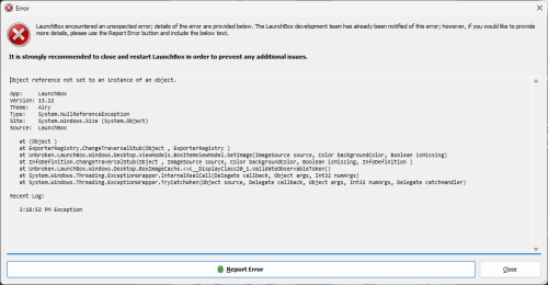 I have been getting this error over the last couple of days and it's driving me crazy. I have my PC games separated into different platforms Epic, Steam, GOG, etc. with one of those being labeled as "PC" which is used to store fan games and it only has 36 games in that section currently. The error only pops up when I'm in the "PC" platform section. It seems to be related to the box art images since the error no longer happens when I temporarily delete the box art folder. I tried to add the images back one at a time to figure out if there was a specific image that is causing the issue but after some testing it seems like it's not tied to a specific image. If I add some images in it will work, then if I close and open LaunchBox the error will sporadically come back. Any thoughts on how to fix this?
