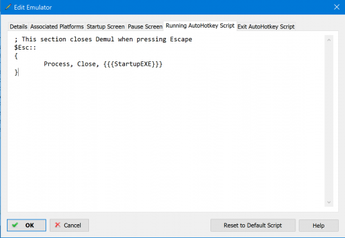 If you have premium then the built in automation will work to close "most" emulators without any additional AHK scripts, any outliers that do not "just work" you add this script to the "running autohotkeyscript" section in manage emulators, and that should then close those stubborn emulators with the same automation combo. ; This section closes Demul when pressing Escape $Esc:: { Process, Close, {{{StartupEXE}}} }