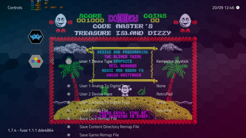8. @Johnny T See in this first image i have user 1 device type set to Kempston. Treasure island dizzy wants K to start the game with Kempston control, as you can see at the bottom of the screen So just bring up the onscreen keyboard with select/back and navigate to k and press the button.