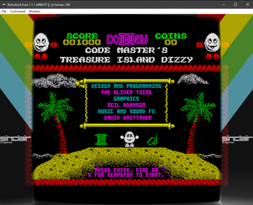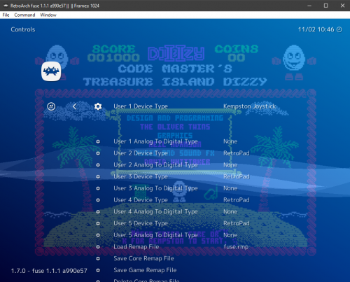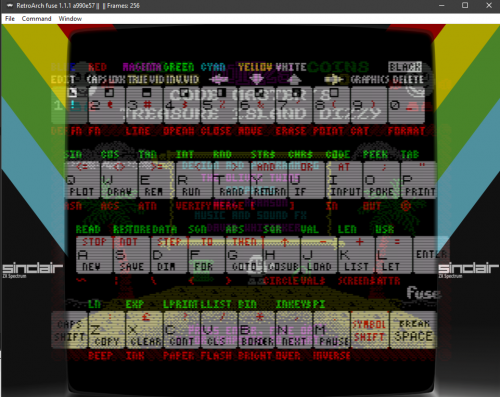 19. Spectrum works just fine in Retroarch with the FUSE core. All my games are .z80 or .tzx files.Bare in mind that the spectrum was a computer so most games will use the keyboard by default, but the most supported joystick for it was kempston so I use that. Just load a game, then go to quick menu/controls and change user 1 device type to kempston then save it as a core remap. Then in games you will need to press a specific keyboard button to use the kempston joystick. In the case below Treasure Island Dizzy says "K for kempston to start" so you need to hit K on the spectrum keyboard, just press select/back on your controller to bring up the onscreen keyboard and navigate to K and hit the button. The game should now start with kempston support which is also what should be specified in your controller options by default now, The button will be different in different games, dizzy wants a K others will want a number, but they should always say what to press on the title screen.