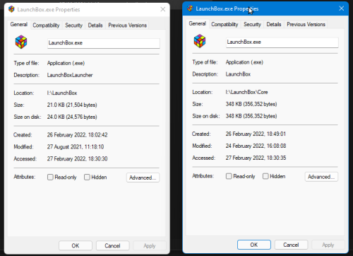 14. I know it says its a exe, but it really isnt, just look at the file size difference between the actual exe in the core folder, and the fake exe/shortcut in the root folder. So it sounds like there is something wrong with the shortcut if the actual exe in the core folder works OK. Id try re-installing the latest version from your Launchbox/Updates folder directly over the top of your install to replace the Launchbox files.