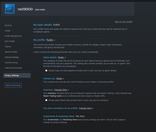 Yeah mine really is no different. https://steamcommunity.com/id/neil9000/ And if you edit your profile and go to the "Privacy Settings" tab it looks like this?