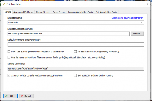 So, with that said, delete that emulator entry, and add a new one, this time call it Retroarch, point to the exe and dont change any other options or add any commands.