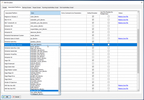As you can see GBA is a pre-populated system and is set to use the vba_next core, so to change that to mgba core simply double click the core that is listed, this will open a dropdown where you can pick from a list of cores (this list is actually the cores you actually have downloaded as we scan the core folder, so if a core you downloaded isnt showing restarting Launchbox should cause it to populate).