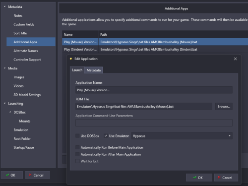 When I combine 2 versions of a game I lose access to change the per additional rom command line parameters. e.g. Dragon's Lair has multiple roms that use the same video files. Or Esh's Arunmilla has multiple languages. Or ActionMax games can use mouse or sinden. I add each game version as an individual game. If I set these additional parameters (per game) it works as expected. When I combine the games it ignores these parameters, the option for command line parameters is also greyed out. When I split the game back to multiple versions the parameters are there and it works fine again.