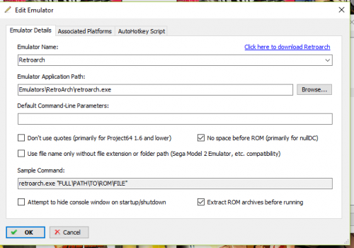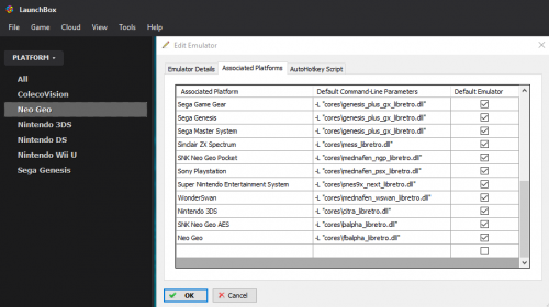 was following ETA Prime's tutorial - he said to use Final Burn Alpha - see his text file below: RetroArch NeoGeo LaunchBox Emulator Name = Retroarch Associated Platforms = NeoGeo Default Command-Line Parameters = -L "cores\fbalpha_libretro.dll" Here are my other options (yes I have Extract Rom archives before running checked) I have the NEOGEO.ZIP BIOS file in the Retroarch/roms directory. The core information tab for the fbalpha core in Retroarch said to put it there. Would you recommend it go elsewhere? Although Retroarch works fine. Could this be a Launchbox bug? My 8 hours of troubleshooting this specific issue with no success is leading me to believe that.
