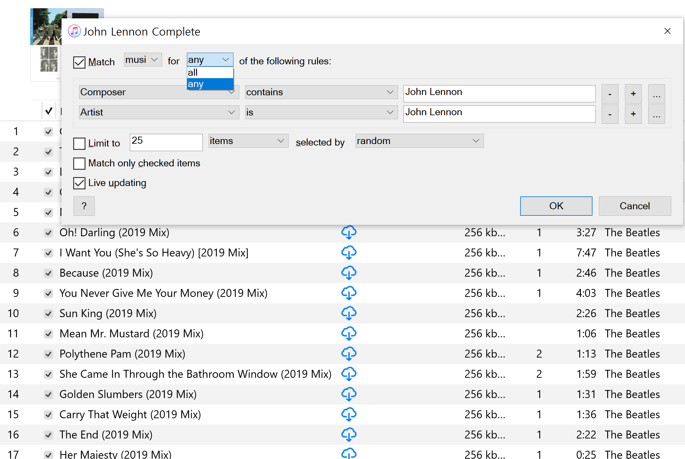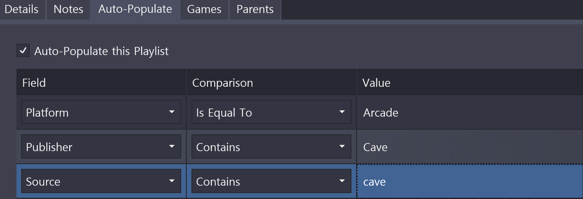 16. 1. I guess we still need "AND" daisy chain multiple fields as they are common for creating smart list..(such as iTunes) I was trying to modify Cave playlist since it's missing some of games. Play list default shows as following: and it shows these game list: But if I try to add another field with source containing "cave" it will only show 5 list since it doesn't sum up both field that matches. This is problem because when I show sources only instead of publisher (default) it will show different game list. If "Cave" is auto-populating the game list, it should show all games that include both published AND source code used by cave. Therefore, fields should have "ANY" or "AND" style to accomplish full list. I found this works 100% perfect with iTunes smart playlist: EX) When I click "all", it won't show The Beatles songs but if I click "any" it will include Beatles and John Lennon, etc.