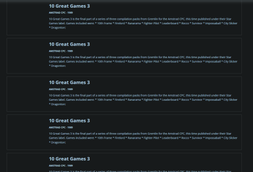It seems that there's plenty of duplicate games being generated at the moment. This is just one example, at least five other games for Amstrad CPC platform alone have multiple duplicates, up to six per game. -