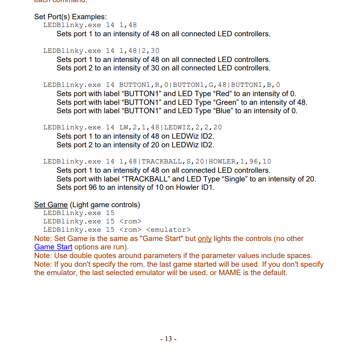 This script is from page 13 of the install and config pdf. I renamed by "bigbox" button to "Button1" just for the sake of using the example shown. I can confirm that the following works. LEDBlinky.exe 14 BUTTON1,R,48 If I attempt to stack the commands using "|", I get nothing. It dose not work with or without quotes. I will dump the log when I get home.