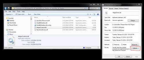 Try this in Windows 1. Open Search button (Cortana) and type PowerShell and Select PowerShell App. 2. Type the command unblock-file -path (Then the full path of the file you want to unblock 3. Repeat for each file Example unblock-file -path "C:\Launchbox\Themes\Aeon Nox\Plugins\HelperControl_v3.dll"