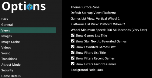 I am using the CriticalZone theme but I experiencing the poor performance even with the default theme. I do not have any game videos downloaded, but I am using platform videos. I don't seem to experience any lag when browsing the platforms. I have attached images of the relevant options.