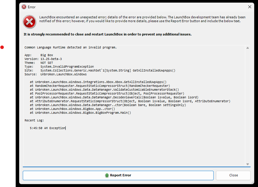 I'm going to assume you don't support Windows 10 (Pro, 22H2) anymore, but in Beta 3 I'm seeing BigBox close (crash) after about 30 minutes of attract mode running, and i see this in the application logs: Beta is running fine on my Windows 11 (Home / 25H2) machine. I'm getting ready to reload this machine with Windows 11, so this isn't an issue for me. Just an FYI. Thanks.