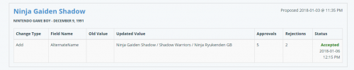 @Jason Carr, I am now going through the list a 2nd time, to ensure all missing games work, and I'm encountering a problem: some of the really bad names have already been deleted. For example, Ninja Gaiden Shadow is listed as "Ninja Gaiden Shadow / Shadow Warriors / Ninja Ryukenden GB" on the Retro Achievements website, and that is the exact alternate name that I entered, and it was accepted. You can see a screenshot of that here: It is already gone. I expected as much - when I first started entering in these alternate names, that was one of my concerns. People will see these terrible alternate names, and just delete them, because they don't know what they're for. Why wouldn't they? They're awful. If I didn't know any better, I'd delete them myself as a moderator. So again, I implore you - create a new region, and call it 'Retro Achievements.' I will personally do all of the legwork, and go back through that long list and add the 'Retro Achievements' region, so that anyone who sees a terribly named game knows what it is for, and will think twice before randomly deleting it. It was a lot of work (16+ hours). I am happy to contribute - but I would like some sort of safeguards in place, so that the work wasn't for nothing.