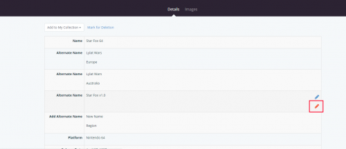 @Drodrick you don't have to actually delete entries without a region, if you put your mouse over the section indicated in this picture, you can then edit the field, or add a region. It would be preferable to not delete existing alternate names, since many Retro Achievements games depend on the names being very specific. If you disagree with the existing alternate name, it would be better to submit a new one than to delete the old.