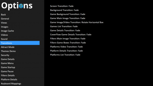 15. As you can see, there is a separate menu for Transitions. If you enjoy customizing settings, I highly recommend that you just look around in BigBox and try stuff out. Most menus should be self-explanatory, in my experience.