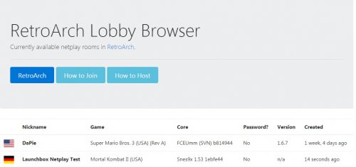 @ckp there is the integrated lobby of retroarch which i didn't implement in my plugin... i forgot to tell @Jason Carr about it so it's good that you mention it: I'm the german flag It can be reached via the web @ http://newlobby.libretro.com/ or more interesting for @Jason Carr, there is an easy to parse json feed available here: http://newlobby.libretro.com/list/ EDIT: I just tested it via the new option to host in LB and it WORKS! It announces to the masterserver if you hit host So @Jason Carr "just" has to parse the feed and we have an integrated serverbrowser in bigbox