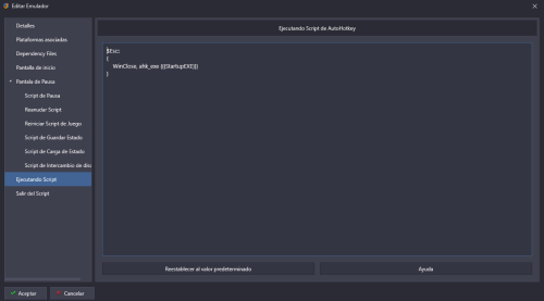 Hi, simple settings to go fullscreen and to close the emulator. Fullscreen: -f Close emulator: $Esc:: { WinClose, ahk_exe {{{StartupEXE}}} }