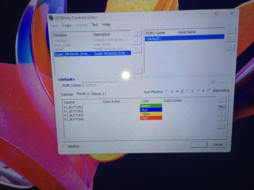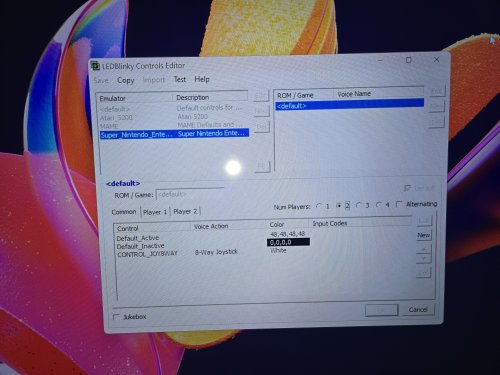 Yep, you are correct. I figured it out. Your youtube video was a life saver. I have only one issue. I can't seem to get my RGB joystick to light different colors at one time. You select common/ CONTROL_JOY8WAY then choose a color. Under the <Default> for player 1 thru 4, there is no option to select JOYSTICK_1 and color. All four joysticks will be the selected COMMON/ CONTROL_JOY8WAY color. There is no option under the Player 1 thru 4 tabs to assign a JOYSTICK color. -