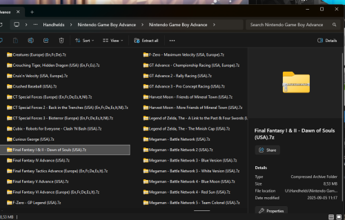 I used Final Fantasy for the GBA in my example, as i'm playing it at the moment at the cheevos are working just fine in the game. Just like lilcheeks, I have all my games on a NAS. And i use 7z for all my games -