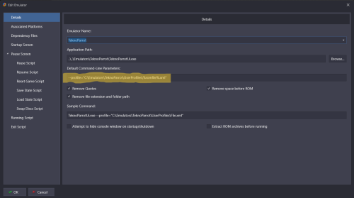 To just move it around it would be Ares.exe %romfile% --fullscreen The work around I usually do is hard code the path and standardize the file name. Also have to add it as a separate emulator name like ares (N64dd expansion) ares.exe "c:\roms\n64\%romfile%.zip" "c:\roms\n64dd\%romfile%-expansion.zip" --fullscreen You would point to the original N64 rom for import. Also have to check the 2 boxes for file path/extension and remove quotes